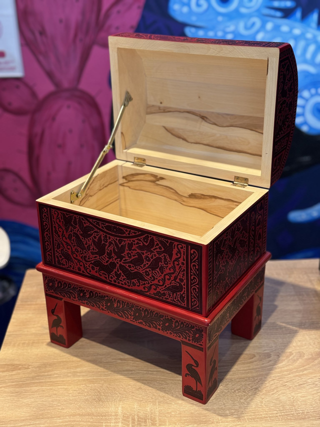Baúl de madera rojo pintado a mano – Diseño de venados, flores, pájaros y patas con flamencos – 3 kg