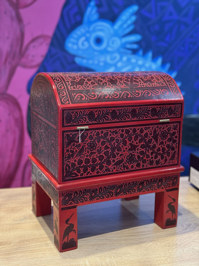 Este hermoso baúl mediano está elaborado en madera y decorado totalmente a mano con un vibrante diseño que incluye venados, flores, pájaros y patas adornadas con flamencos pintados.
